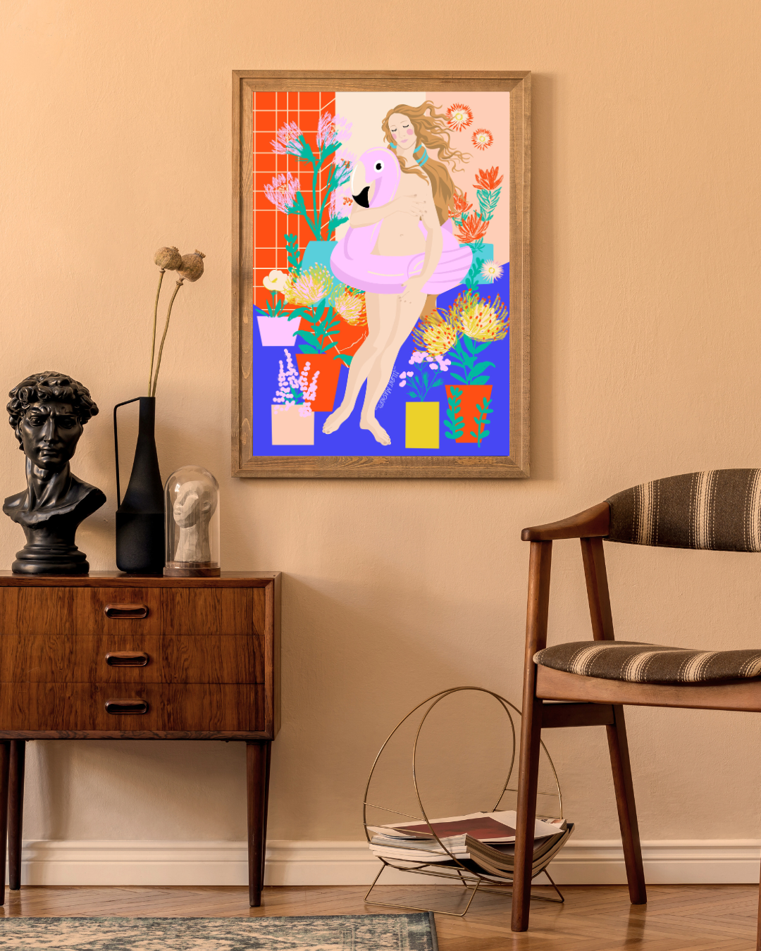 Picture Venus, the goddess of love, taking a well-deserved break in "Venus on Vacation." This print captures her in a lighthearted moment of relaxation, swapping her traditional attire for beachwear and a sunhat. It's a humorous and imaginative take on classical art, inviting you to see ancient myths through a modern lens of fun and frolic.