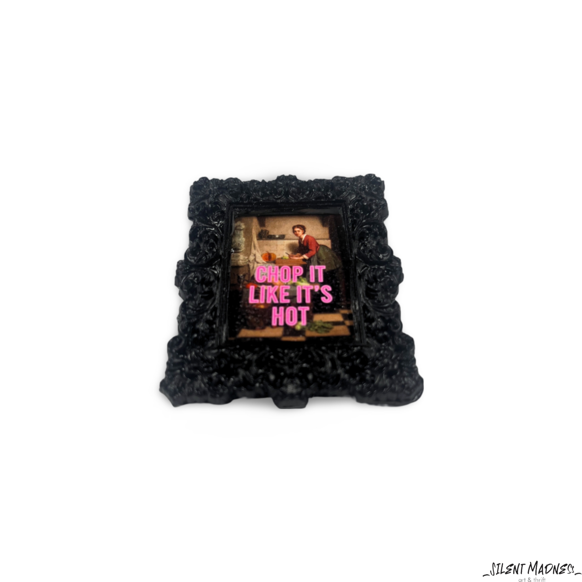 Spice up your cooking routine with this magnet that adds a dash of humor to meal prep. It's a playful reminder to approach chopping, dicing, and slicing with flair and enthusiasm.